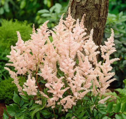 - Astilbe (Astilbe spp.) With feathery, plume-like flowers in shades of pink, red, or white, astilbes brighten dark corners from late spring to early summer. Care tips: Plant in rich, organic soil. Keep evenly moist; astilbe is not drought-tolerant.