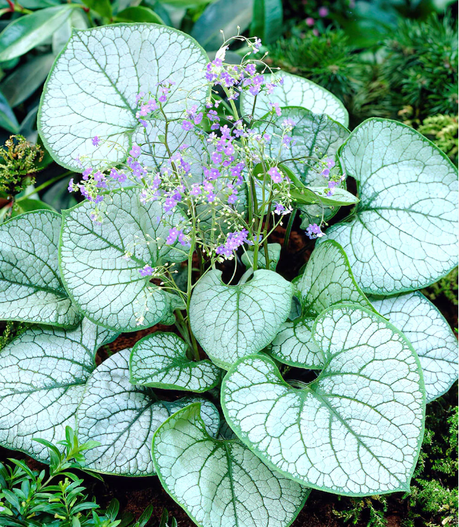 - Brunnera (Brunnera macrophylla) Forget-me-not-like blue blooms accompany heart-shaped leaves in this hardy perennial.